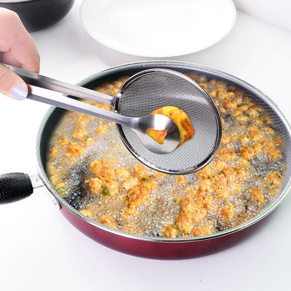 SUPER HANDY DESIGN - 1,5 inches diameters of the tongs & 3,1 inches of the strainer are ideal for most deep-fried foods. 7,2 inches handle is also very comfy to grip.